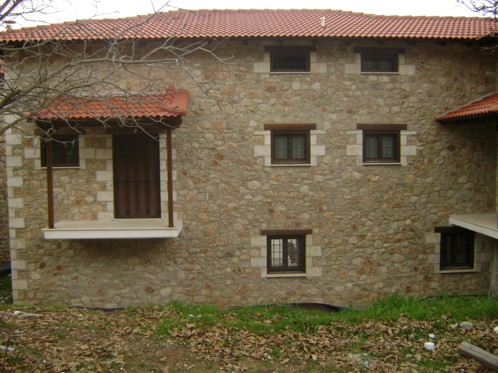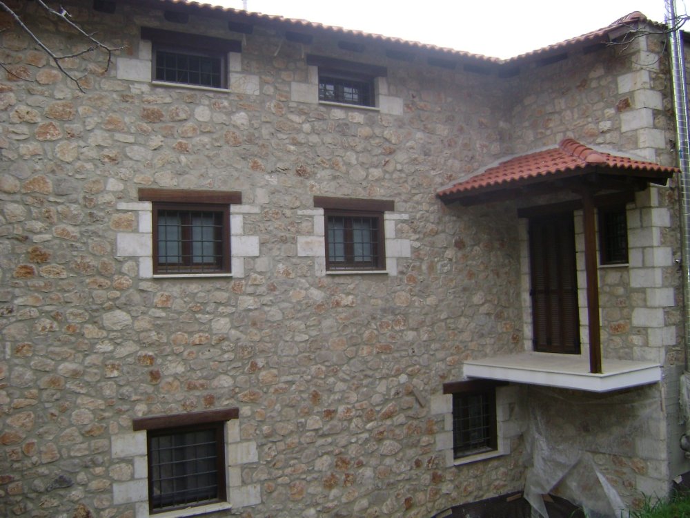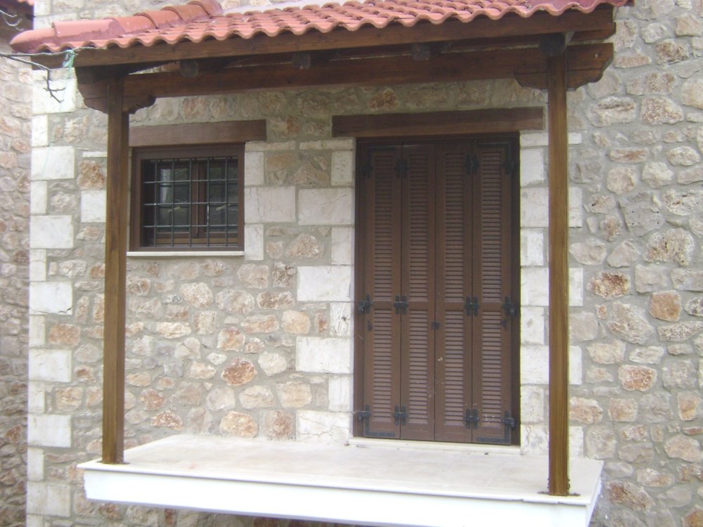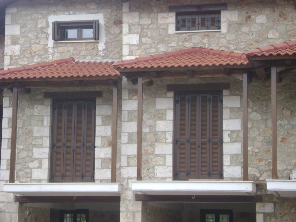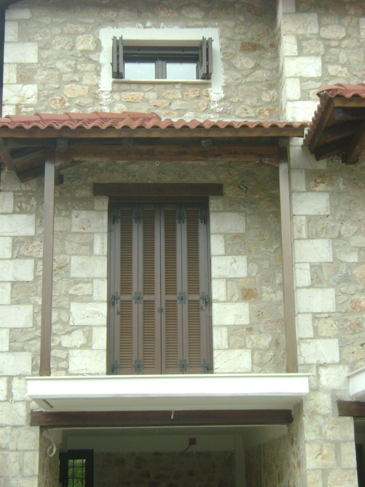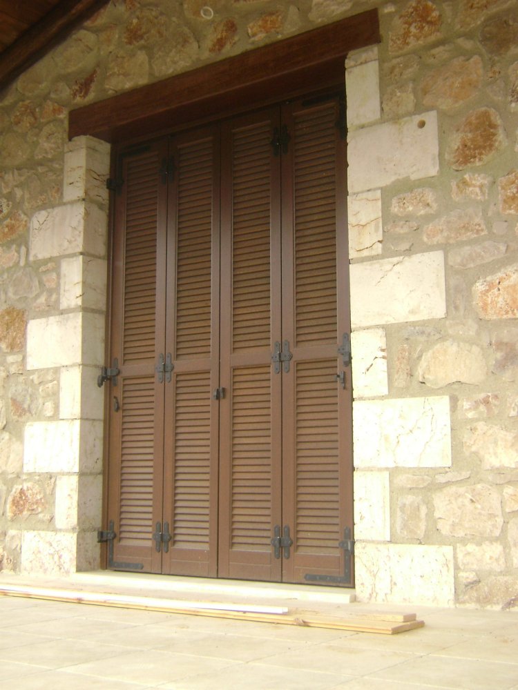 Ξυλεία Μεράντι σε βερνίκι με παντζούρι τύπου φυλλαράκι και είσοδοι Δήμητρα Α0000 με κανονικούς ταμπλάδες.